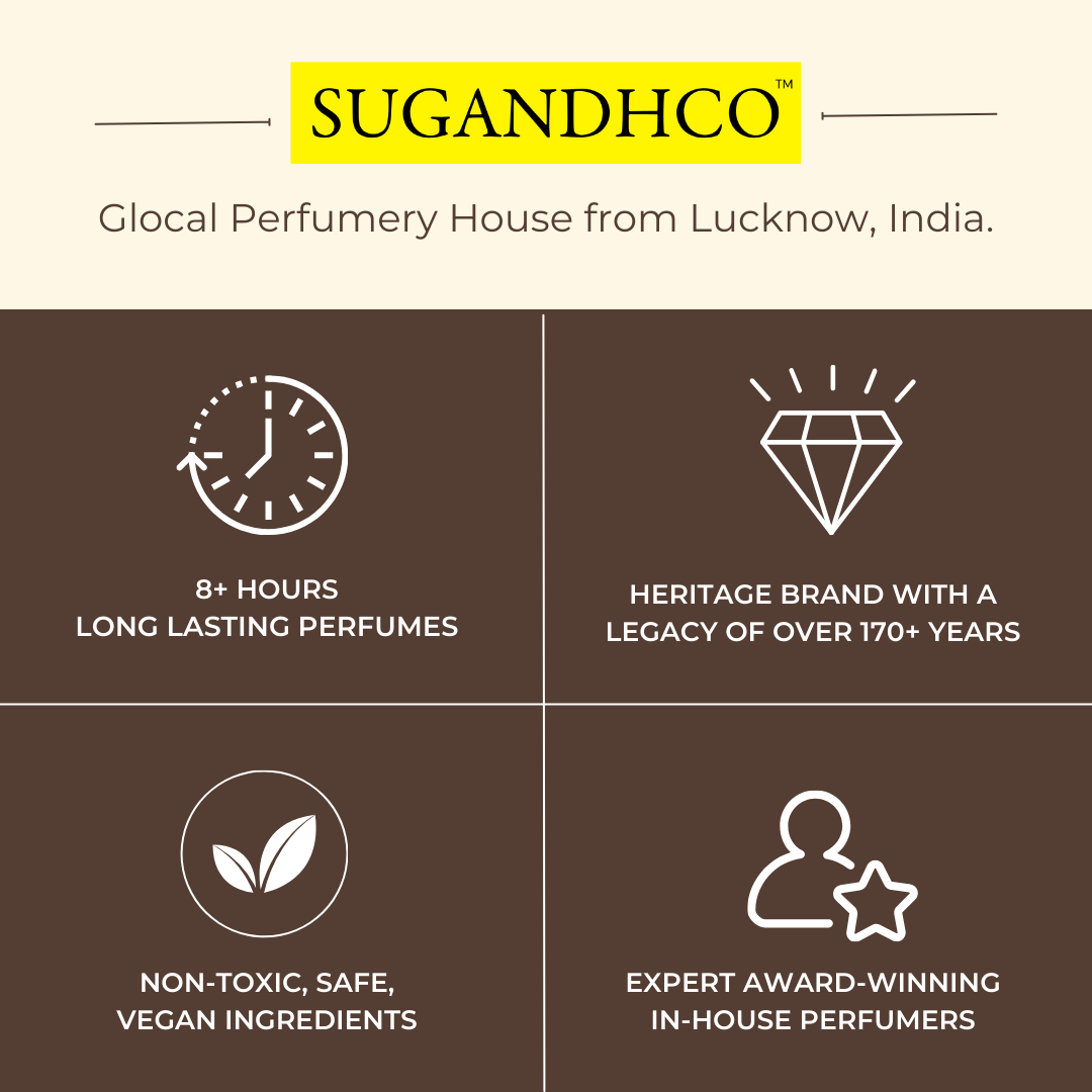At SUGANDHCO, we carefully choose the best ingredients to make long-lasting and captivating perfumes. Our scents include rare notes that give them a luxurious and sophisticated feel. We use high-quality ingredients that are vegan and ethically sourced. Each perfume we make reflects our commitment to quality and provides a lasting fragrance experience for everyone to enjoy.