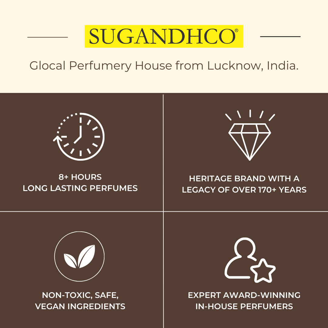 At SUGANDHCO, we carefully choose the best ingredients to make long-lasting and captivating perfumes. Our scents include rare notes that give them a luxurious and sophisticated feel. We use high-quality ingredients that are vegan and ethically sourced. Each perfume we make reflects our commitment to quality and provides a lasting fragrance experience for everyone to enjoy.