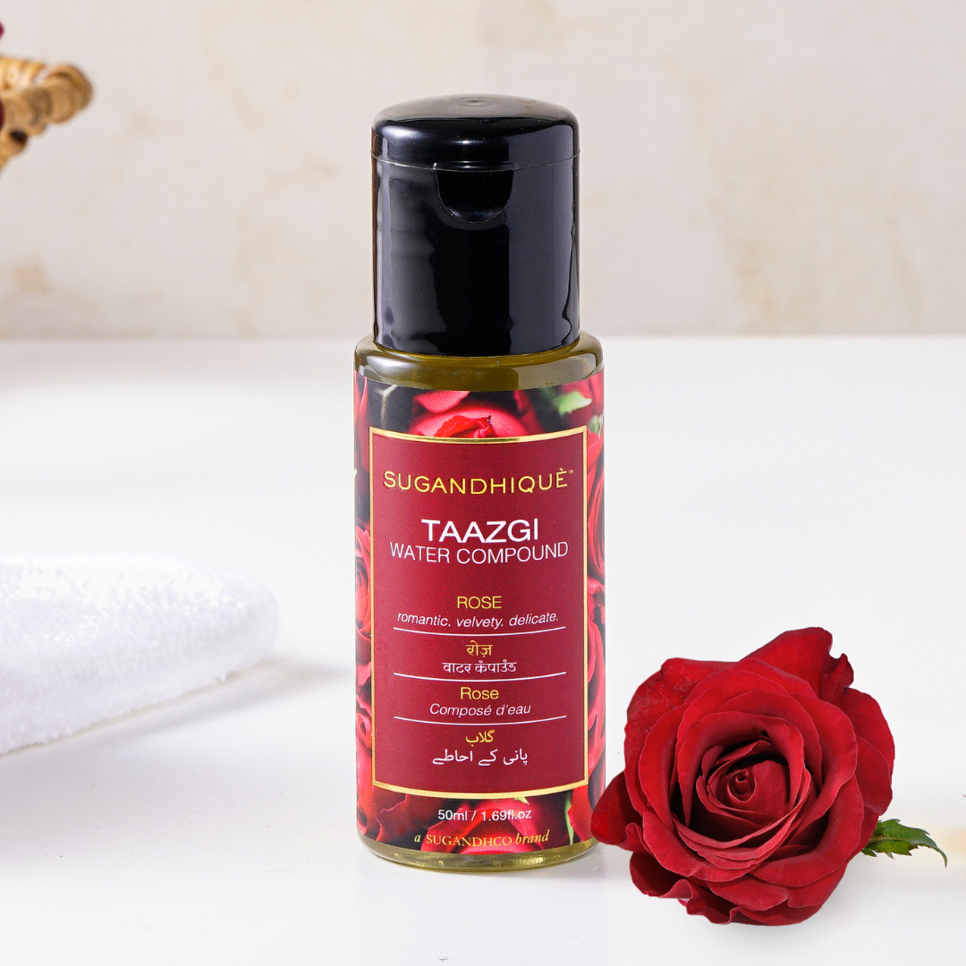 Taazgi Rose Water Compound 50ml: A couple of drops are sufficient in a bucket full of water for a soft and pleasing aromatic experience.